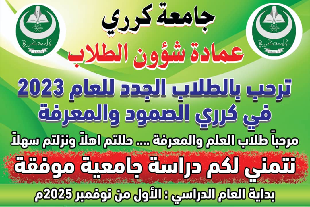 تعلن جامعة كرري عن بداية العام الدراسي 2023 - 2024 م للطلاب الجدد ابتداءا من الاول من نوفمبر 2025م