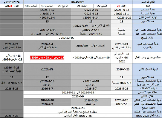 :تعلن امانة الشؤون العلمية عن التقويم الدراسي لجميع الكليات و جميع المستويات والخاص بتكملة الاعوام 2023/2024 و 2024/2025 المؤجلة و ذلك خلال العام 2026 وفق الاتي